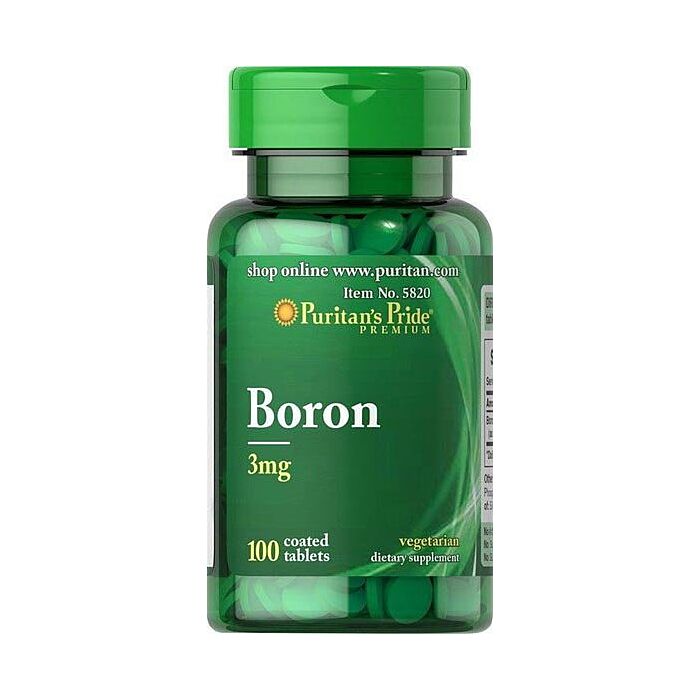 Boron 3 mg від Puritan's Pride – це антистаріння, підтримка пам'яті та розумової діяльності, здорового стану кісток та сексуальної активності у чоловіків та жінок. Бор допомагає жінкам, які мають проблеми з гормональним фоном і кістковими ушкодженнями, і відіграє вирішальну роль, як кофактор і каталізатор у регуляції сну, больових відчуттів і коливаннях настрою, а також відповідають за здоров'я та відновлення м'язів.
